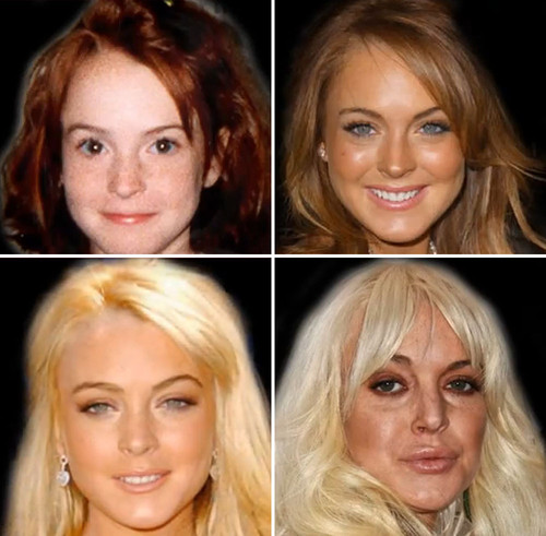 Por otra parte Lindsey Lohan una de las que hace ya años fue la niña mimada de la cadena de televisión,que protagonizó películas como "Tu a Londres y yo a California" y "Just my luck", desde que dejó Disney también ha sufrido importantes cambios ya que además de verse involucrada en juicios por drogas y alcohol, y hacer alguna que otra visita a la cárcel, se ha vuelto adicta al botox. Aquí os dejo unas imágenes de como poco a poco se ha transformado, en la última foto aparece completamente demacrada y no aparenta para nada los 26 años que tiene.